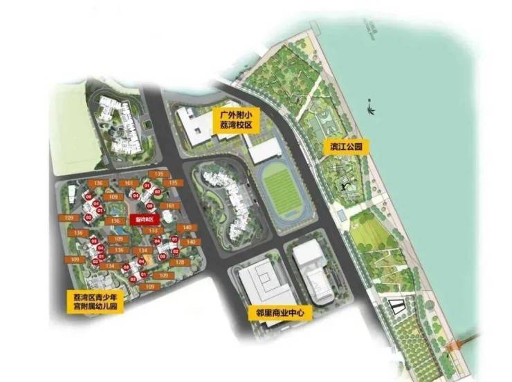 广外附小(设有30个班级)现已正式开学授课。而荔湾少年宫附属幼儿园(拥有12个班级)则坐落于小区之内。