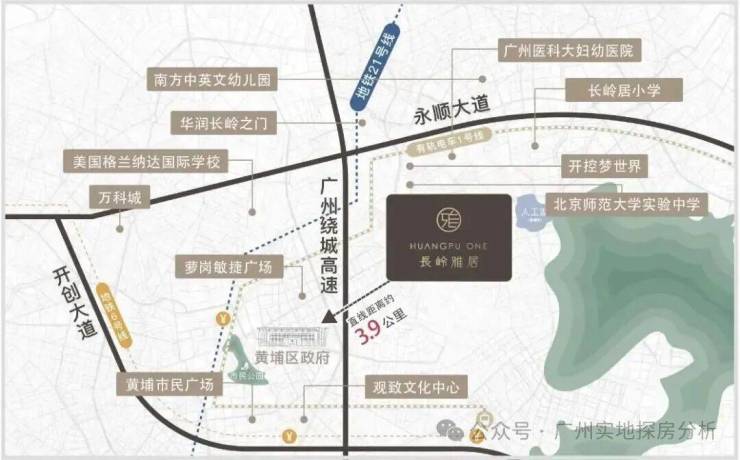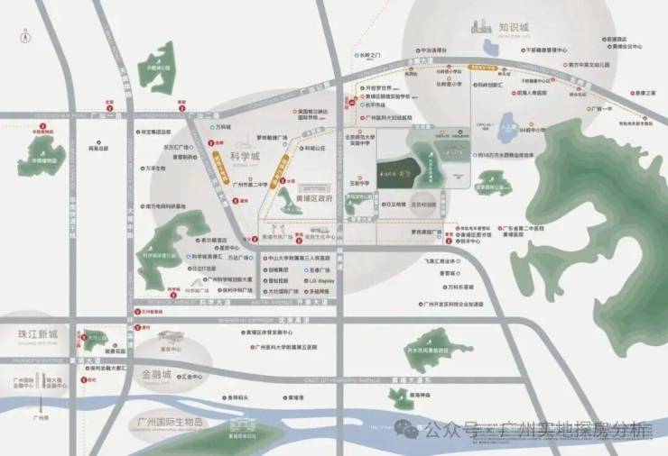 项目坐落于黄埔长岭居板块,紧邻科学城,是该区域内一处低密度、适宜居住的优雅之地。不仅可以享受到黄埔科学城中央商务区的便利与繁荣,同时还被优美的生态环境所环绕。从这里出发,距离黄埔区政府直线距离仅约3.9公里,地理位置极为优越。