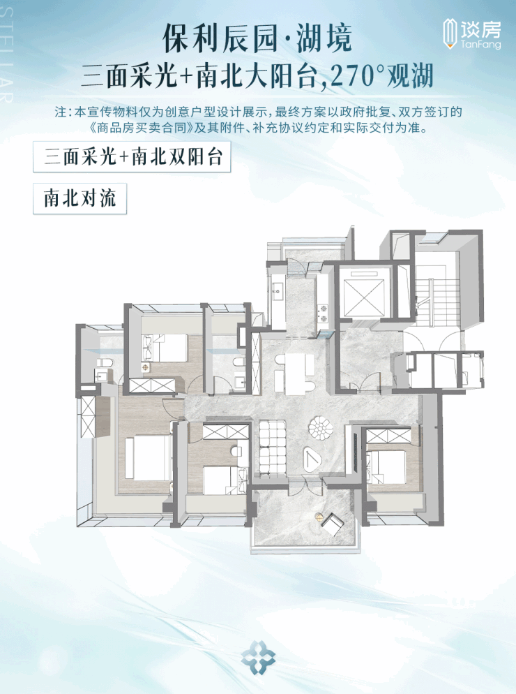 双阳台南北设计,不仅使得空气对流更为强烈,空间功能区分明显,主阳台的景观视野上更为契合一线湖景的优势。