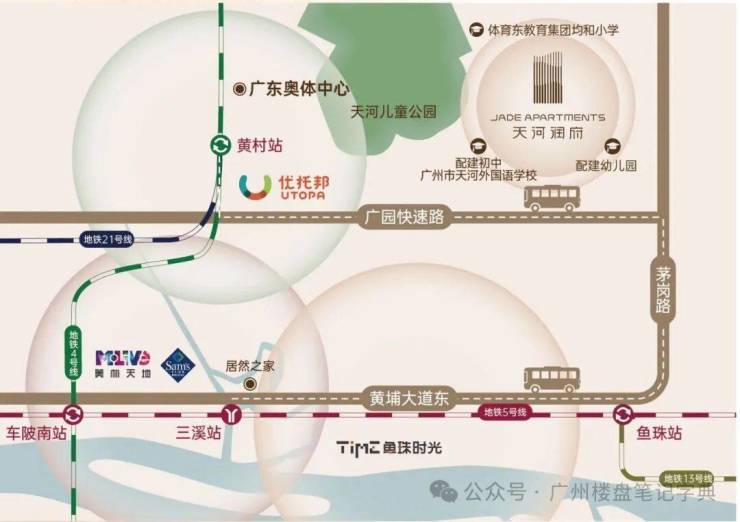 5号线/13号线双地铁交汇鱼珠站、5号线三溪站;3站金融城CBD,7站珠江新城