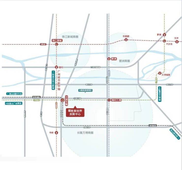 耀胜新世界广场项目位于万博-长隆商圈三轨交汇枢纽之上,三号线和七号线及佛莞城际轨道线交汇, 生活圈串连起珠江新城中央商务区、高铁南站及白云机场,快速便捷辐射东莞、广州、佛山三个大湾区城市。