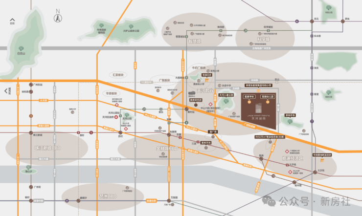 虽无地铁直达,但可通过免费楼巴接驳地铁站,自驾经广园快速路可快速通达珠江新城、金融城、琶洲等核心商圈,出行效率较高。