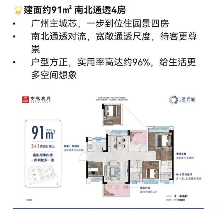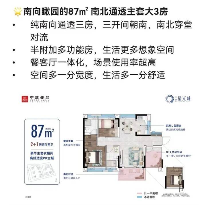 产品:项目总体南低北高,保证日照需求,蝶形设计,保证户户朝南,围合式布局,保证户户望园林。中建星光城分两期建设,目前在售69㎡-100㎡户型。