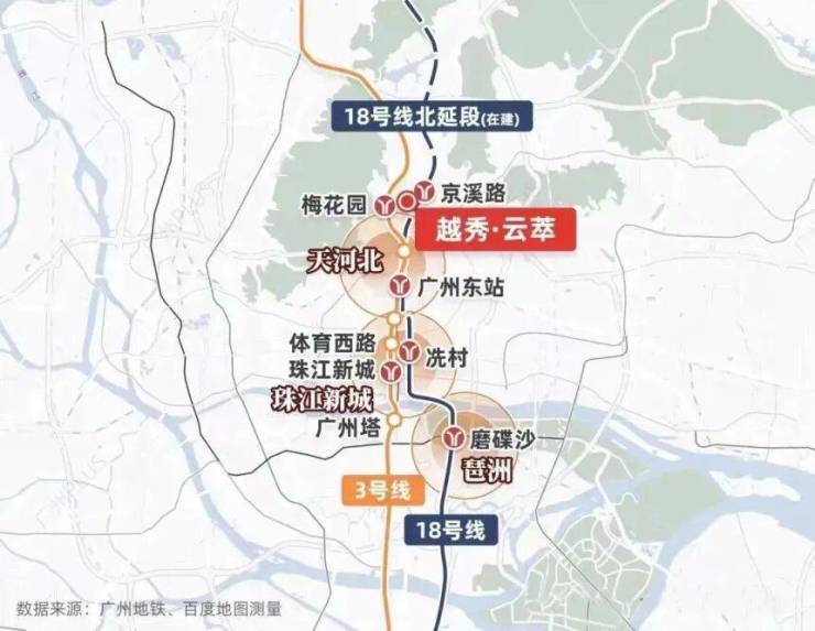 搭乘 3 号线 4 站能到珠江新城,早高峰通勤时间基本可控制在 40 分钟内。