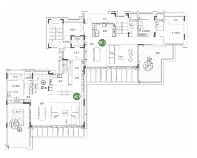 户型排布从石榴岗河自东向西依次升高,保证了约300米宽的生态水景面。