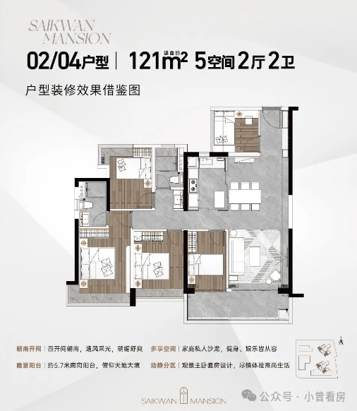 121㎡户型则更适合计划添丁的家庭,最亮眼的是次卧与客厅的隔墙为非承重墙,可根据需求改造成大宽厅,灵活性很高。同样是LDKB一体化厅堂设计,家人互动更顺畅,5.7米宽的阳台更是加分项,既能摆放休闲桌椅赏景,也能作为孩子的游戏区,演绎多种生活场景。厨房空间充裕,烹饪动线合理,平时做饭不会显得拥挤。