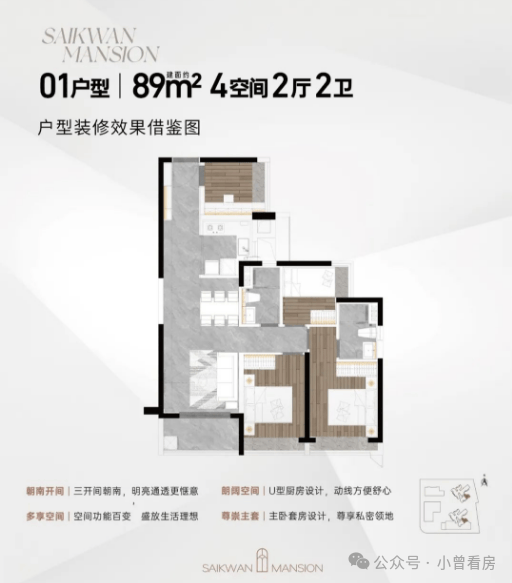 89㎡户型是三口之家的优选,采用LDKB一体化设计,把客厅、餐厅、厨房和阳台打通,活动空间更显开阔,4空间布局还带套房式主卧,独立卫浴保证了居住私密性。这个户型的空间使用率表现不错,加上全屋智能系统加持,日常居住既方便又省心。