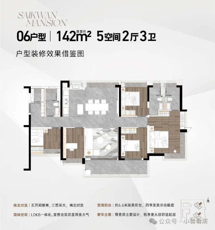 142㎡户型堪称“一步到位”的选择,适合二胎家庭或三代同住。南北对流的板式结构,让室内通风采光都很好,即便在广州潮湿的回南天也能保持干爽。5空间布局搭配双主套设计,长辈和年轻人居住都有独立空间,互不干扰。开放式餐厨空间可以放下大圆桌,逢年过节家庭聚餐很方便,定制的玲珑岛台串联起烹饪区与用餐区,传菜更便捷,大大提升了生活效率。