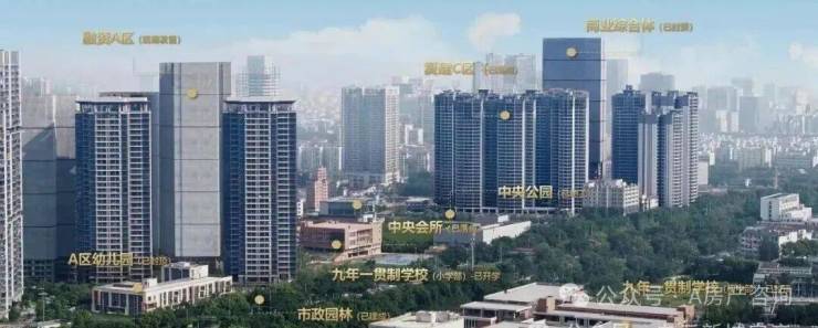 目前九年一贯制学校小学部已落成,与A组团仅一路之隔。