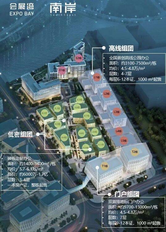 【会展湾.南岸】占据会展新城核心位置,引领全球湾区封面资产,是千亿会展经济圈首发之作。办公产品:低密生态独栋总部