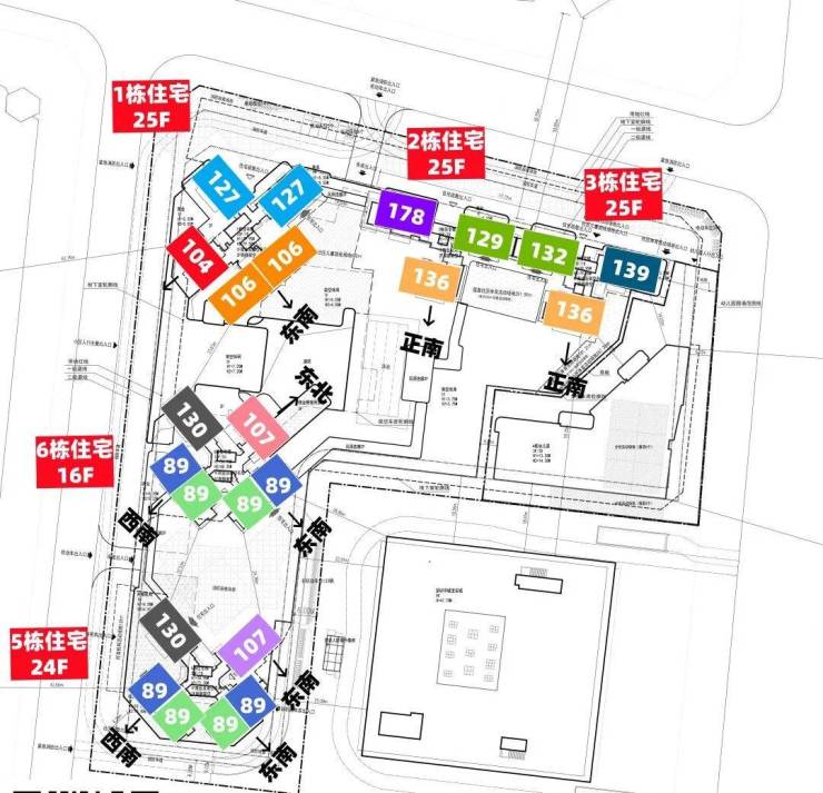 总规划462户,全部都是商品房,2/3栋是2梯3户,1栋2梯5户,5/6栋2梯6户设计,规划停车位530个,车位占比约1:1.15。