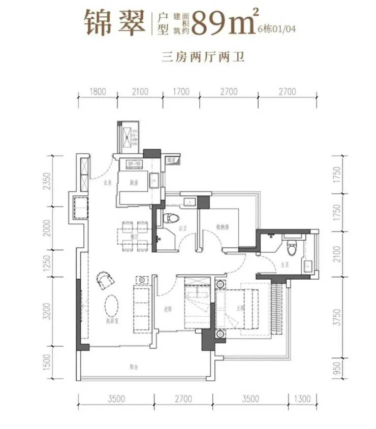 89㎡的3房2厅2卫,6栋01/04户型,设计的是经典竖厅格局,客厅3.5米开间,LDKB一体化,S墙设计预留冰箱卡槽位,三开间朝南,动静分区,主卧+次卧270°无柱转角飘窗,卫生间干湿分离,得房率约97.47%(包含赠送),客厅连接次卧出大阳台约11.46平,西南或东南朝向。