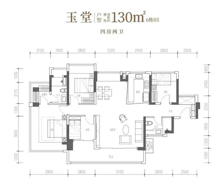 130㎡的4房2厅2卫,设计的是竖厅南北通透格局,进门独立玄关,客厅5.1米开间,客餐厅分离化设计,主卧270°无柱转角飘窗+衣帽间,卫生间干湿分离,得房率约101.95%(包含赠送),客厅连接次卧出超大阳台约14.09平,东北朝向。