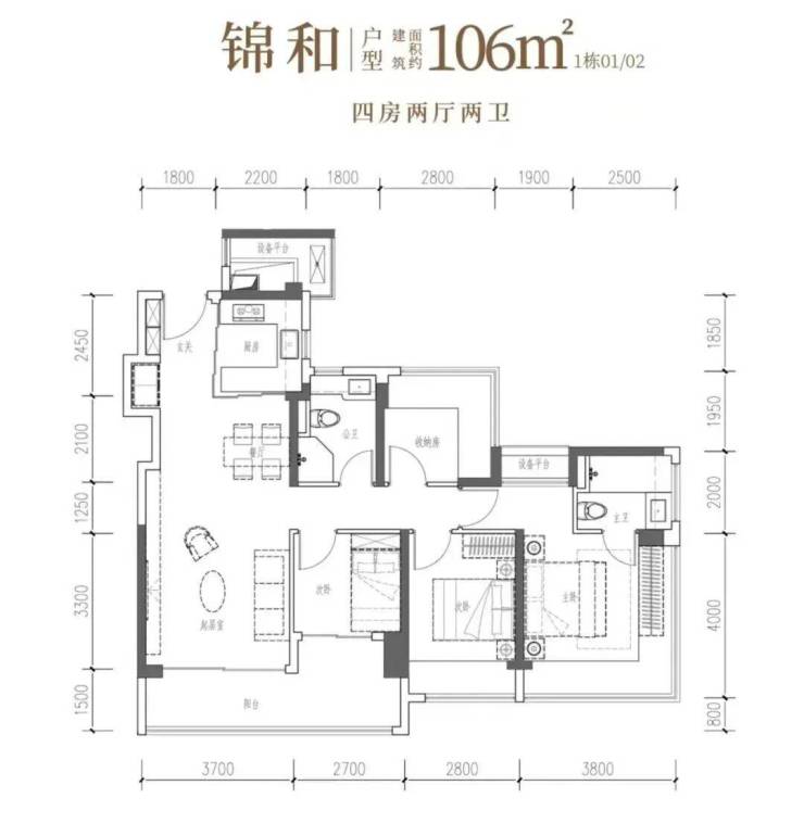 106㎡的4房2厅2卫,设计的是竖厅格局,客厅3.7米开间,LDKB一体化,S墙设计预留冰箱卡槽位,四开间朝南,动静分区,主卧270°无柱转角飘窗还带1个设备平台约1.52平,卫生间干湿分离,得房率约101.16%(包含赠送),客厅连接次卧出大阳台约11.76平,东南朝向。