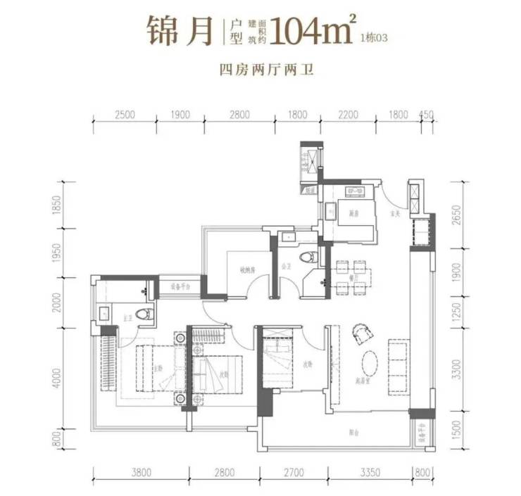 104㎡的4房2厅2卫,设计的是竖厅格局,客厅4.15米开间,LDKB一体化设计,预留冰箱卡槽位,四开间朝南,动静分区,主卧270°无柱转角飘窗还带1个设备平台约1.52平,卫生间干湿分离,得房率约100.71%(包含赠送),客厅连接次卧出大阳台约11.23平,西南朝向。