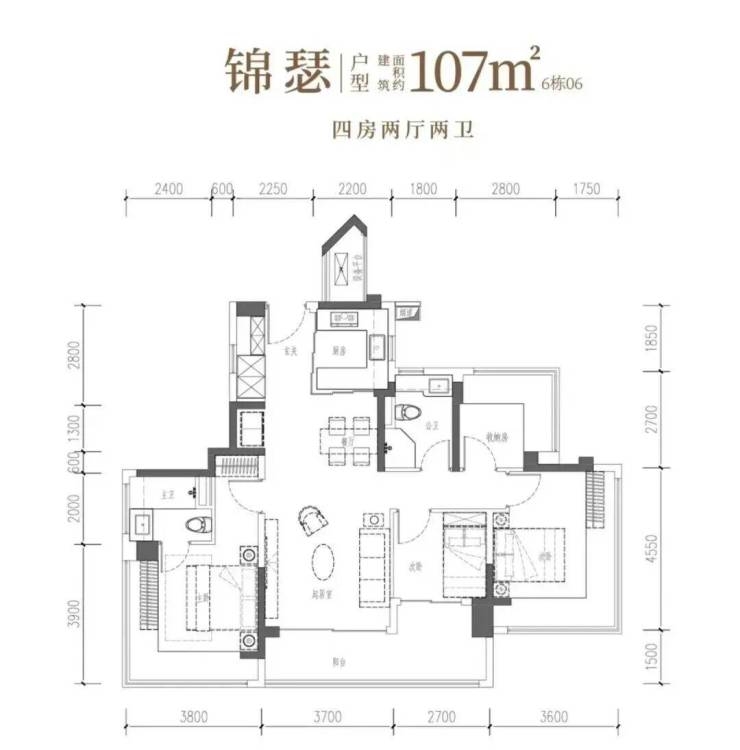 107㎡的4房2厅2卫,设计的是竖厅双龙抱珠格局,客厅3.7米开间,LDKB一体化设计,预留冰箱卡槽位,四开间朝南,主卧+2个次卧270°无柱转角飘窗,卫生间干湿分离,得房率约104.06%(包含赠送),客厅连接次卧出超大阳台约11.76平,东北朝向。