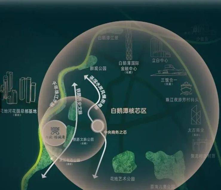 【白鹅潭核心区发展】 白鹅潭地区作为广州主城核心区,规划投资约2500亿,定位为千亿经济势能,形成东西两翼黄金三角格局,包括地标项目如白鹅潭国际金融中心等。