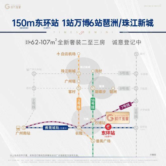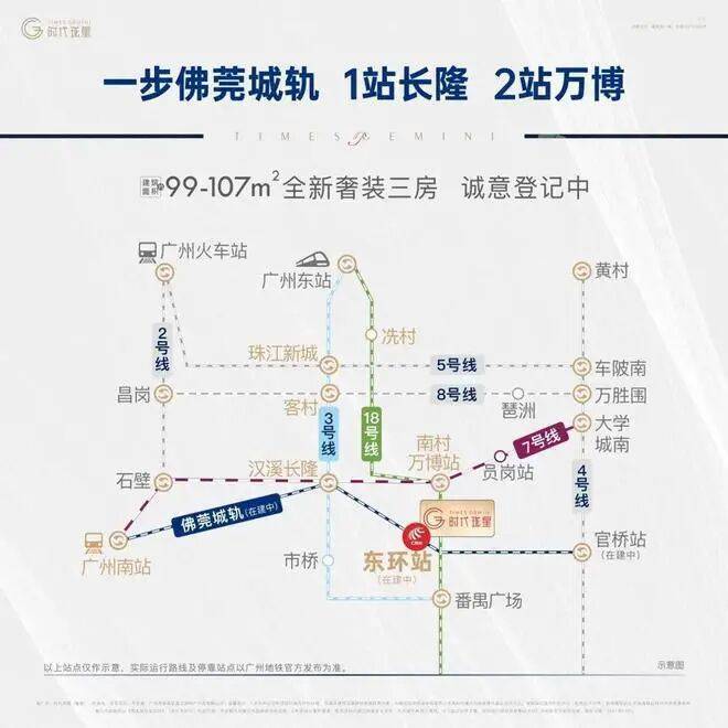 交通方面,项目150米到城轨站。1站即达长隆站,可换乘地铁3和7号线,2站到万博可以环乘18号线、30分钟到珠江新城。