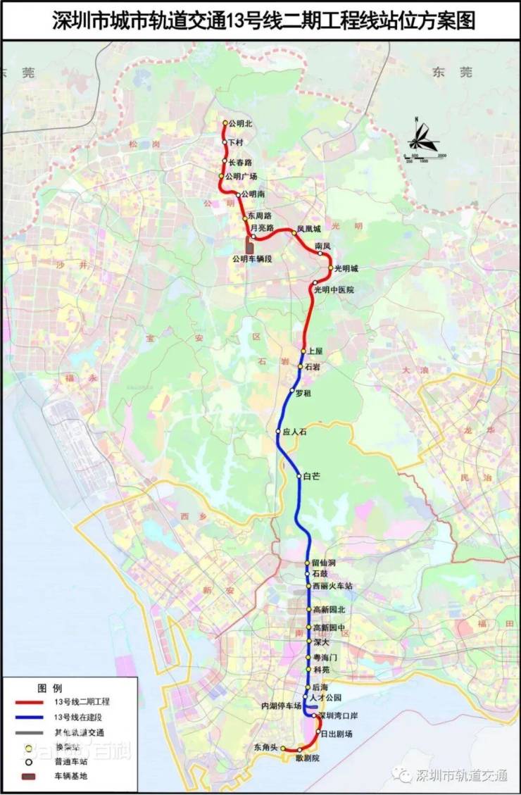 ①13号线及其南、北延长线(建设中,预计2025年开通)起于东角头站,终于公明北站,纵贯光明、宝安、南山,线路开通后约30分钟可抵达南山核心区,约45分钟可达深圳湾口岸,以高新技术人才为主要客流,被称为高新技术人才专线