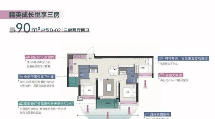其中87㎡三房两卫设计实用,部分户型赠送面积达7.52㎡,使用率最高可达96%