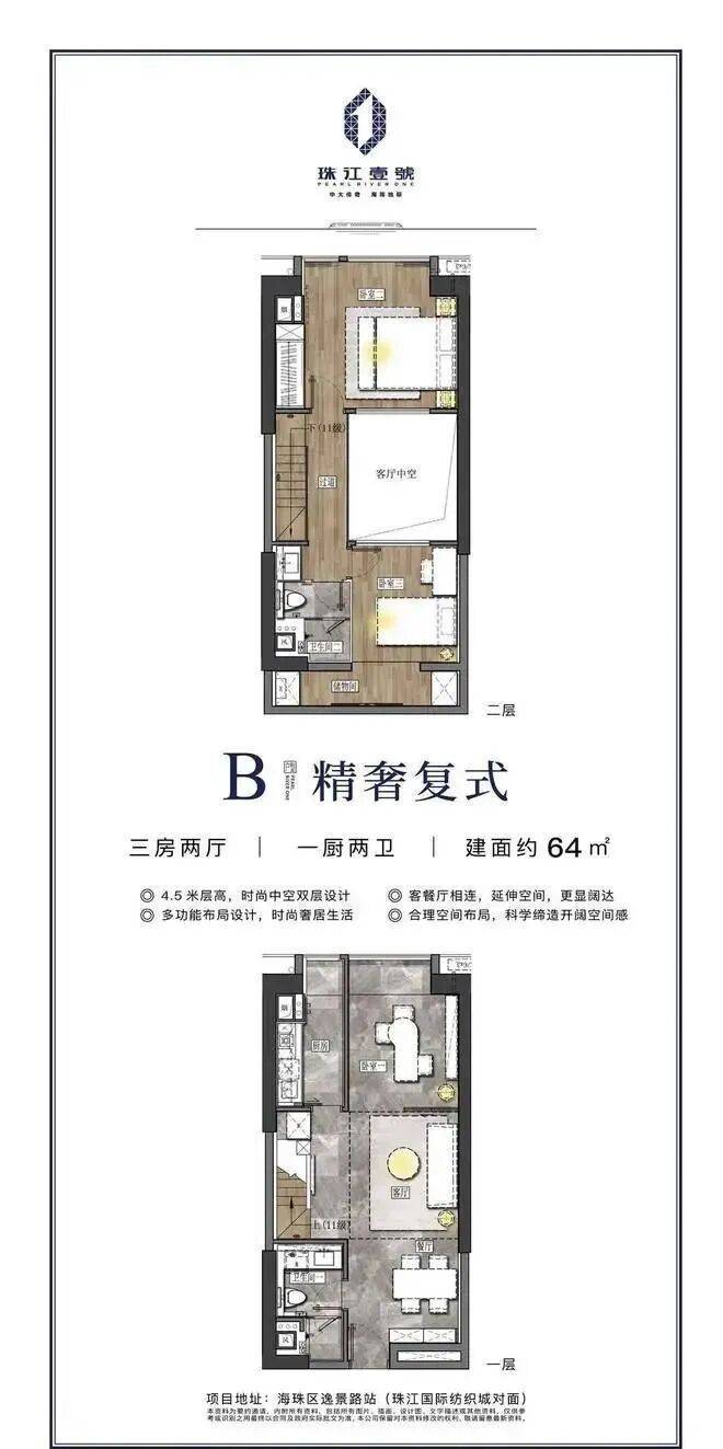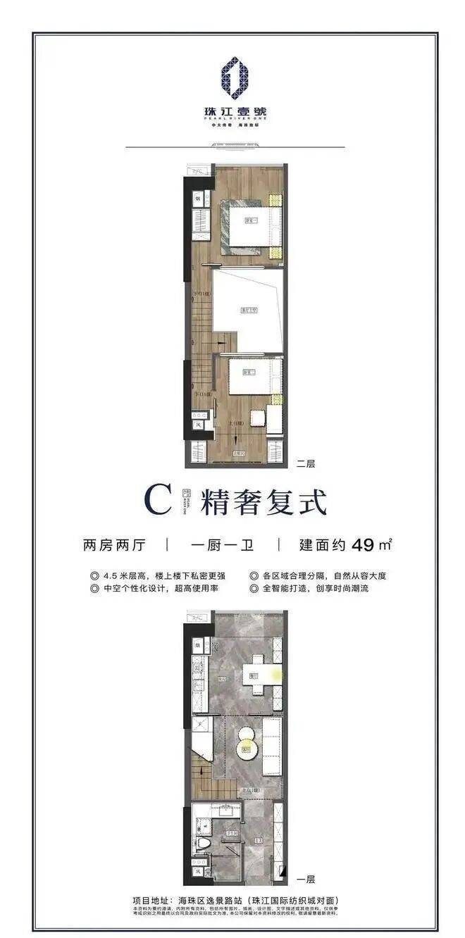 珠江壹号主推49-95㎡时尚LOFT空间,4.5米层高,使用率非常高,买一层可享受两倍的奢阔空间。而且户型多样,总价可控,能满足各阶段的住房需求。