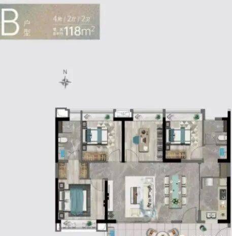 B户型:建面约118㎡3+1房两厅两卫