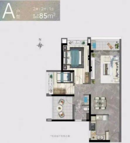 A户型:建面约85㎡2+1房两厅一卫