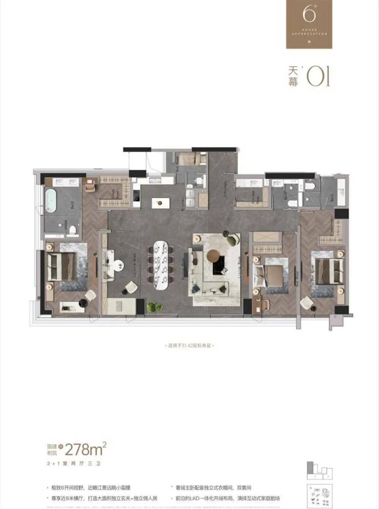 项目一线临江,搭配现代商务全玻璃幕墙,南高北低,最大程度展现一线江景。