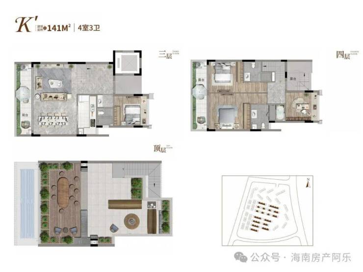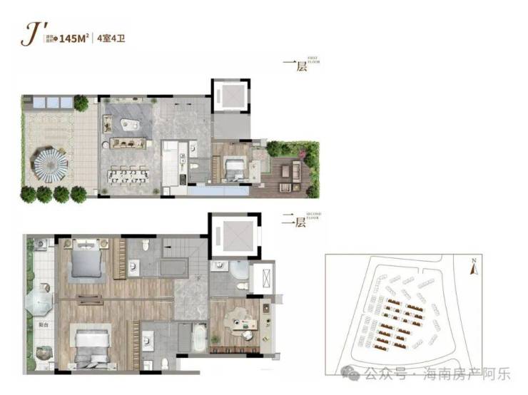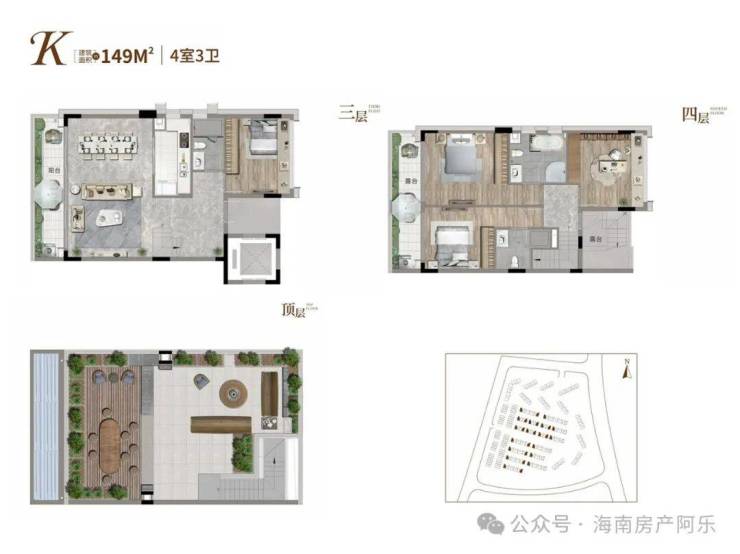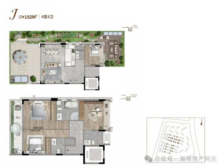 叠拼别墅:上叠建面141-149㎡四房三卫,带约63㎡顶楼露台+约35㎡地下室,总价约350-450万元/套;下叠建面145-152㎡四房四卫,带约50-114㎡花园+约80㎡地下室,总价约450-600万元/套。