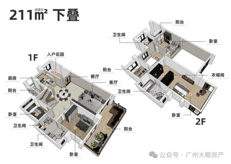 下叠户型建面约211㎡,但注意了,它自带有超大花园,面积媲美一个小户型!