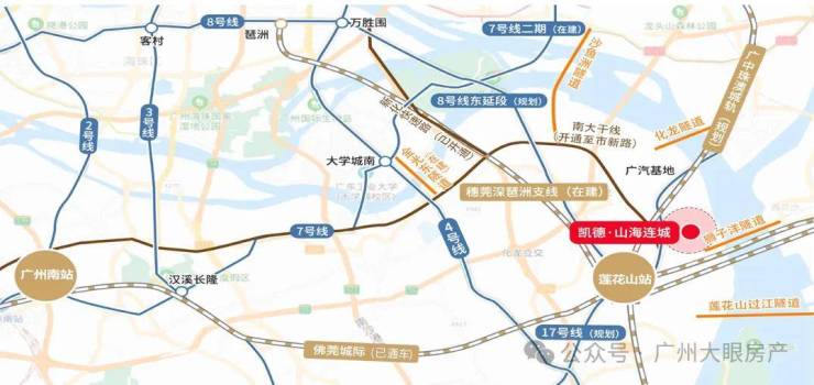 公共交通不算好,目前出行基本上靠自驾,最近的地铁4号线都要10公里,后续周边有规划地铁8号线东延线{莲花湾至万胜围}预计2027年底通车,全程8个站,通车后,莲花湾到海珠只要20分钟,且目前这边公交线路也比较少。