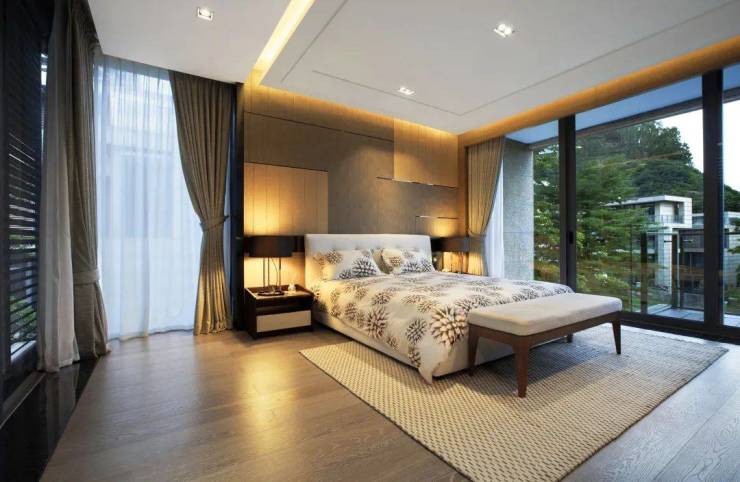 从会客厅、宴会厅、厨房等开放空间,到卧室、浴室等私密空间,采用了大面积落地玻璃设计,增强空间关联性。