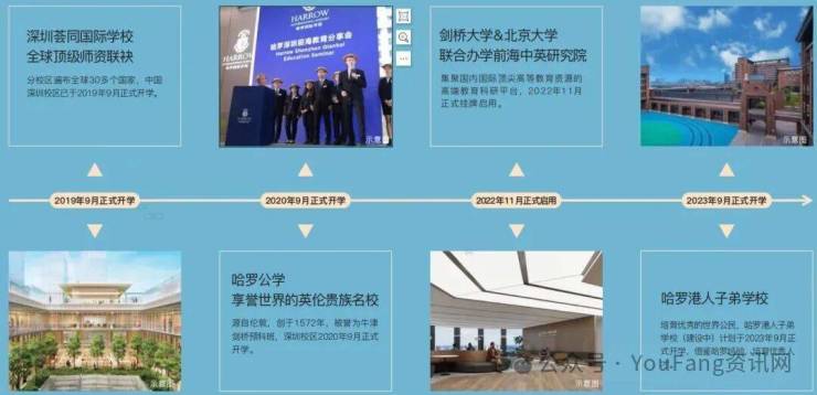 世界著名学校英国哈罗公学(已开学)、哈罗港人子弟学校(在建中)、美国荟同国际学校(已开学),以及剑桥大学&北京大学联合办学前海中英研究院(已开学)