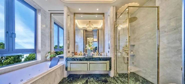 🌙 主卧浴室墙面采取马德望白奢石,地面是普拉达绿奢石;