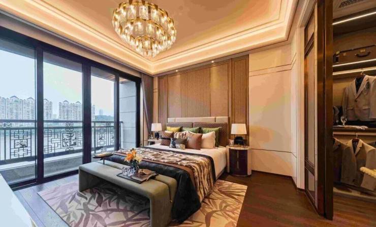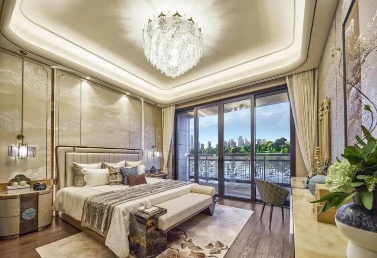 🌙 主卧承接青绿山水的主调,扪皮主材点缀金属线,现代与古典相融;