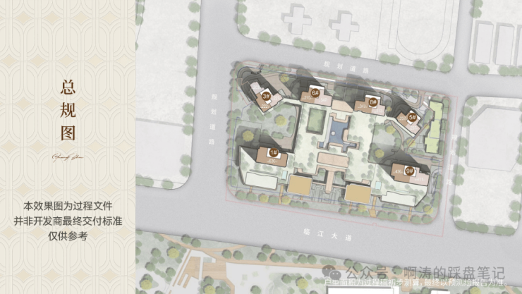 项目地势做了整体抬升,整体排布北高南低,呈半月型布局,共计6栋住宅。前低后高,前排2栋分别为35层和37层,后排4栋从东往西分别是50层、49层、49层和50层,前高后低的设计,以及后排两栋楼的扭转,也实现了100%望江,货量共约500来套。