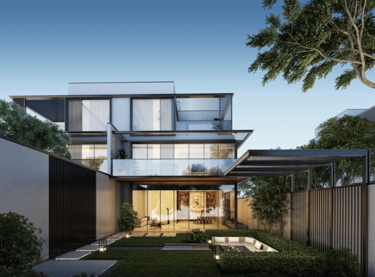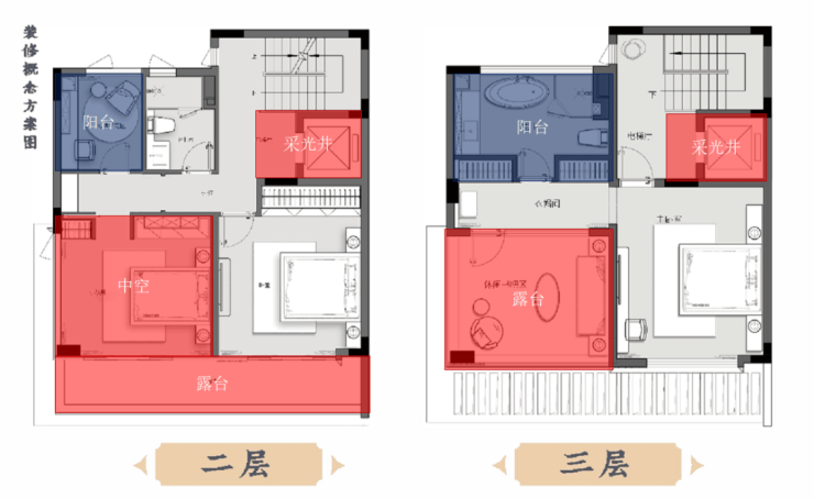 部分戶型規劃為下沉式庭院,打造雙層院落,以及配有前後花園,有天有地,舒適生活由此起。