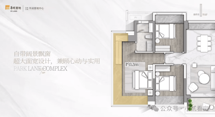 最吸睛的是它的主卧去到28㎡,而且做了约12米长的270°无遮挡U型飘窗,室内光线敞亮,空间通透,非常有豪宅感。