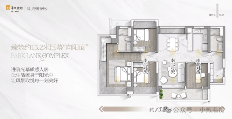 不仅南北对流通透,而且南向采光面去到约15.2米,这基本在140㎡+户型才会有的尺度。