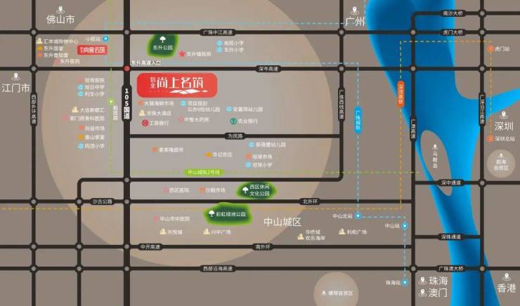 珠三角:30分钟向北即可沿广珠西线到达广州南,40分钟到广州天河;深中通道通车后45分钟即可达到深圳。向南沿珠三角环线及广澳高速1小时内就可珠海横琴、澳门等粤港澳大湾区主要城市及主城区。