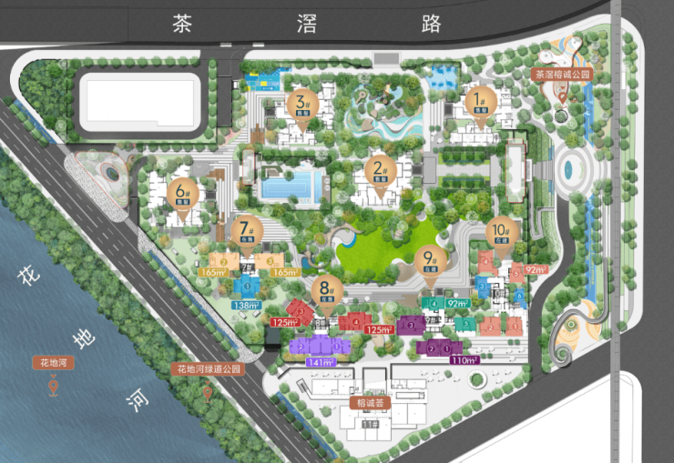 休闲——直距江面约30米,坐拥约8.44km一线花地河无界视野;以及有花地河绿道公园、茶滘榕诚公园、铁路文化公园(在建,一期已开放)和华南植物园科普园(规划)等四大公园环绕。