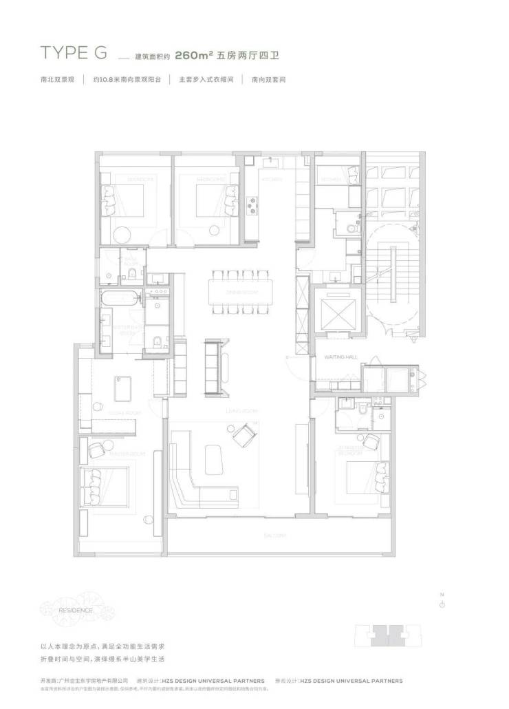 260-315㎡五房:南向超10米景观阳台、巨幕宽厅、独立保姆间与主套衣帽间,部分户型更设灵动功能岛,实现生活场景自由切换。