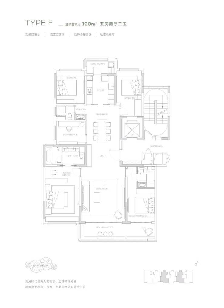 190-230㎡五房:南北双阳台、双洄游动线、中西双厨配置,适应多代共居;
