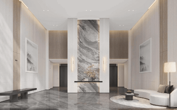 建筑群层高9-17层,纯板式结构南北对流布局,确保每一户皆享有充沛日照与通风。首层入户大堂层高约6.6米,相当普通住宅两层之高,墙面饰以浅色奢石与浅木质材,营造出开阔却不失温度的归家仪式感。弧线元素延续至室内公区、栏杆收口与景观节点,以柔化刚,细腻关照居者的情绪体验。