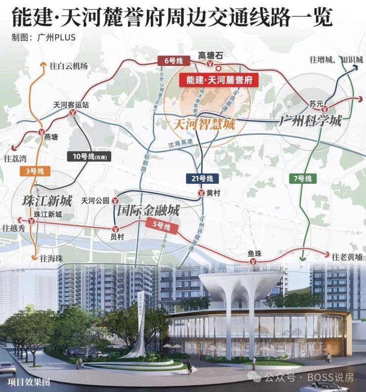 该项目位于天河区天河智慧城(CTD),距地铁6号线高塘石站约700米。天河智慧城与天河中央商务区(CBD)共同构建天河“一区双核”发展格局。珠江新城产业已饱和,未来发展核心将转向天河智慧城,板块内新增量将持续涌现,配套逐渐完善。