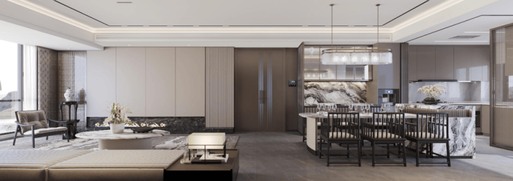 在大师团队的妙笔下,整个项目规划建设7栋塔楼、8栋板楼、15栋叠墅,高层围绕南面的黑白面将军山和南屏水库形成为围合之势,将面宽1000米的湖景和5000米的山景资源最大化,实现建筑与外部环境的融合协调。