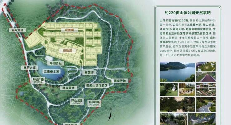 半山秘境,稀世低密。项目坐落白云山半山之上,三面环山,临湖而居,坐拥220亩私属山体公园。整体规划约300亩土地,打造5-6层低密小高层,容积率仅0.8,堪称广州最低密度住区。背山面湖,藏风聚气,成就一方云山胜境。