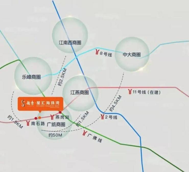 广州11号线(在建)贯穿项目,广州首条环城地铁,0换乘直达琵洲、广州火车站、广州东站;距广佛线燕岗站约450米,接入3号线,7站到达珠江新城;海珠环岛路(在建)工程进度不断刷新,价值即将兑现。