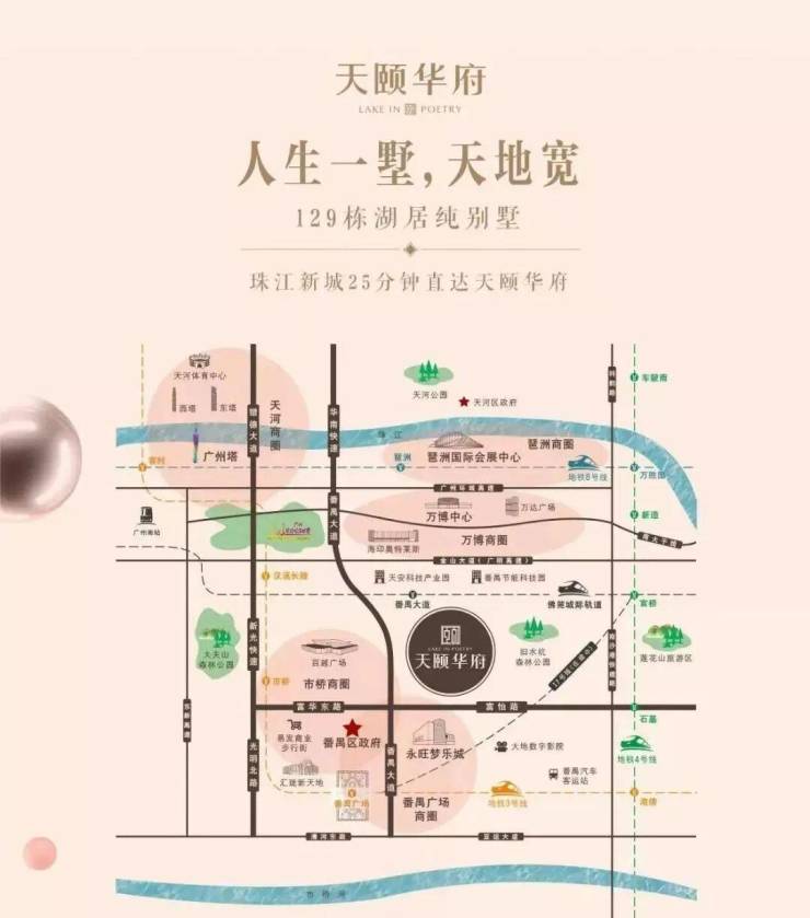 作为番禺广场板块唯一纯别墅,天颐华府于天赋地脉之上,集萃一城精华。北接广州第四CBD万博板块,南承对外开放门户枢纽南沙自贸区,东靠番禺创新经济与产业开发板块,西连南站板块。