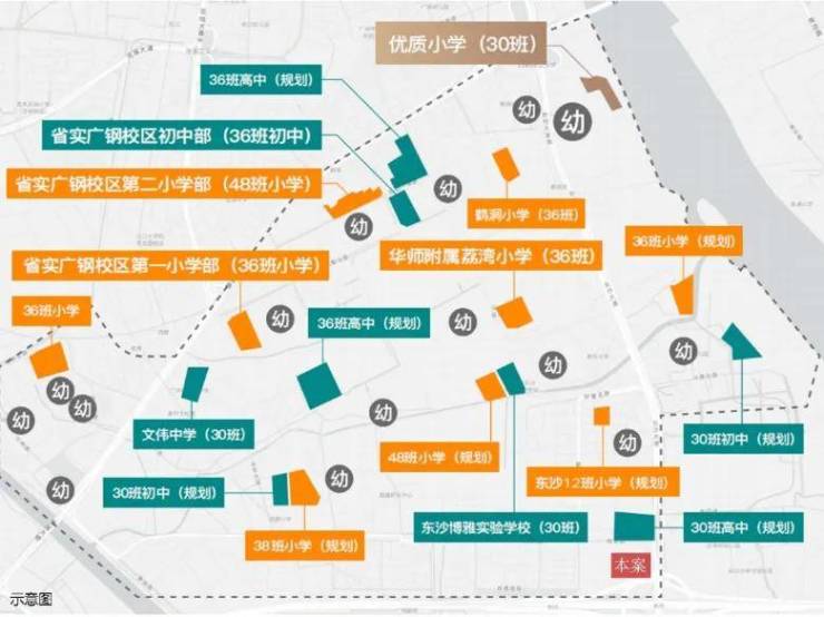 两所九年一贯制在旁,优质中学环伺约1公里规划有两所九年一贯制学校,并且广州市第四中学、广州市西关外国语学校、广东实验中学、广东广雅中学初中部、广州市荔湾区金道中学(真光中学托管)五大学府林立。